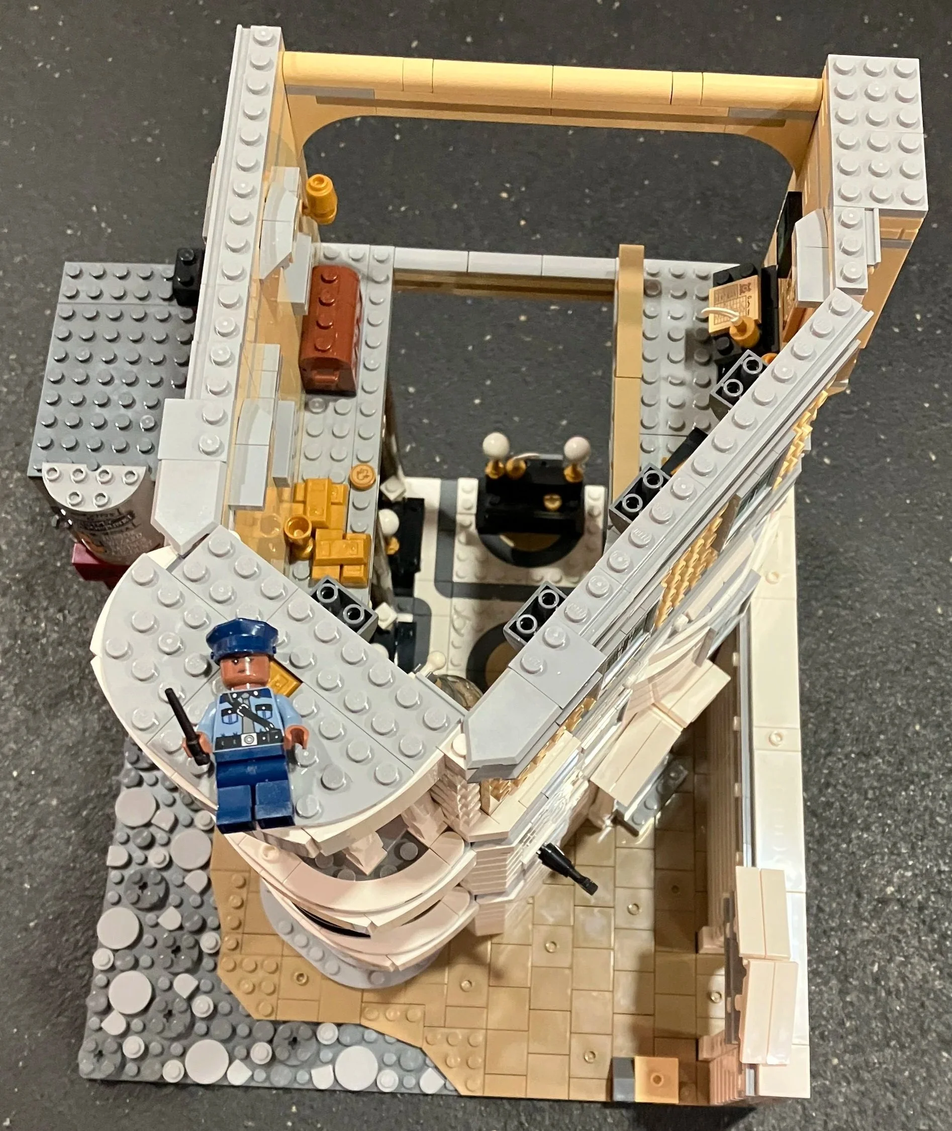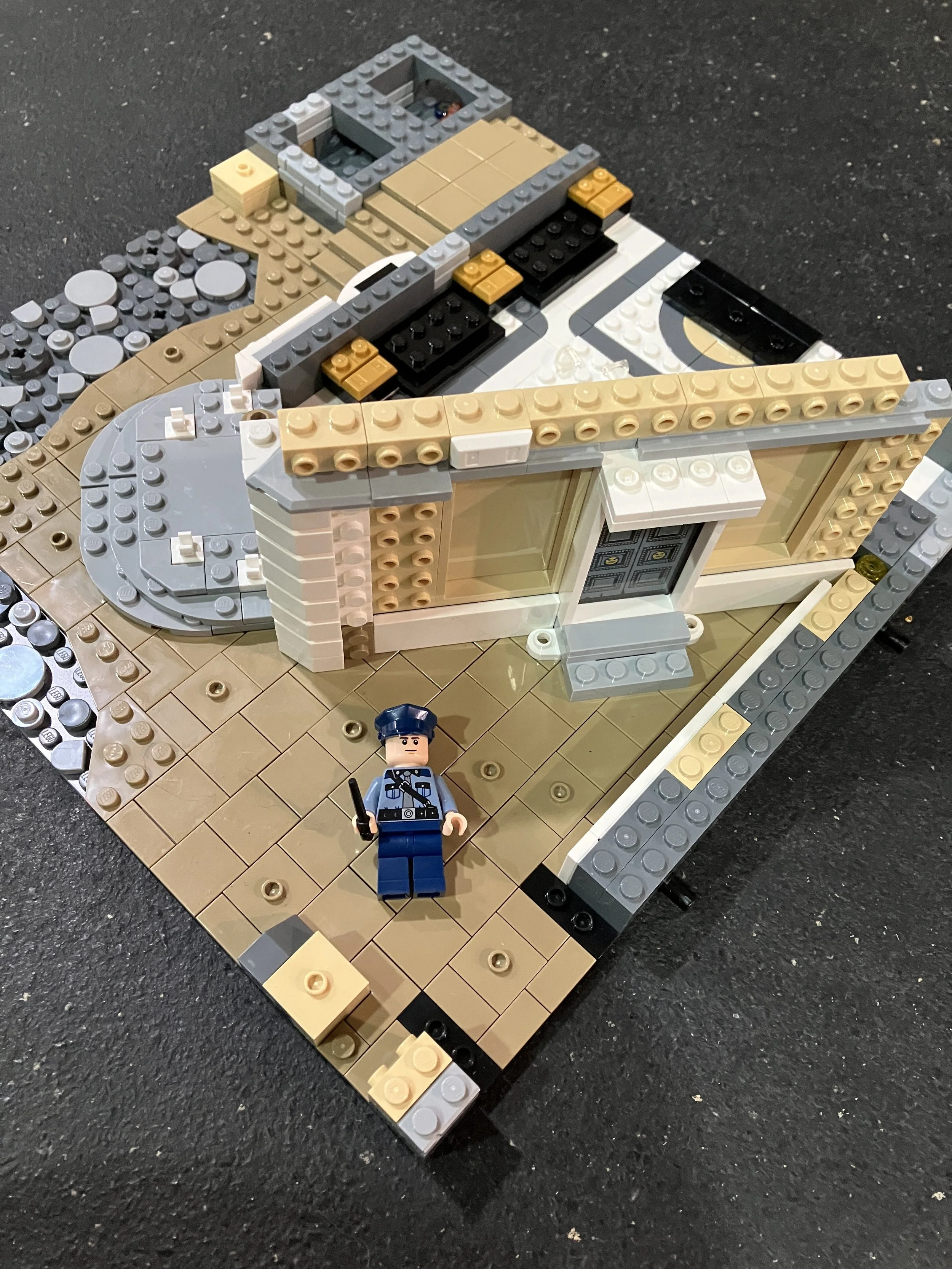 Bags 27 and 28 add another layer to the bank. Bag 28 adds another balcony with the same angled columns as the other two layers on the front. It also adds another security guard minifigure.