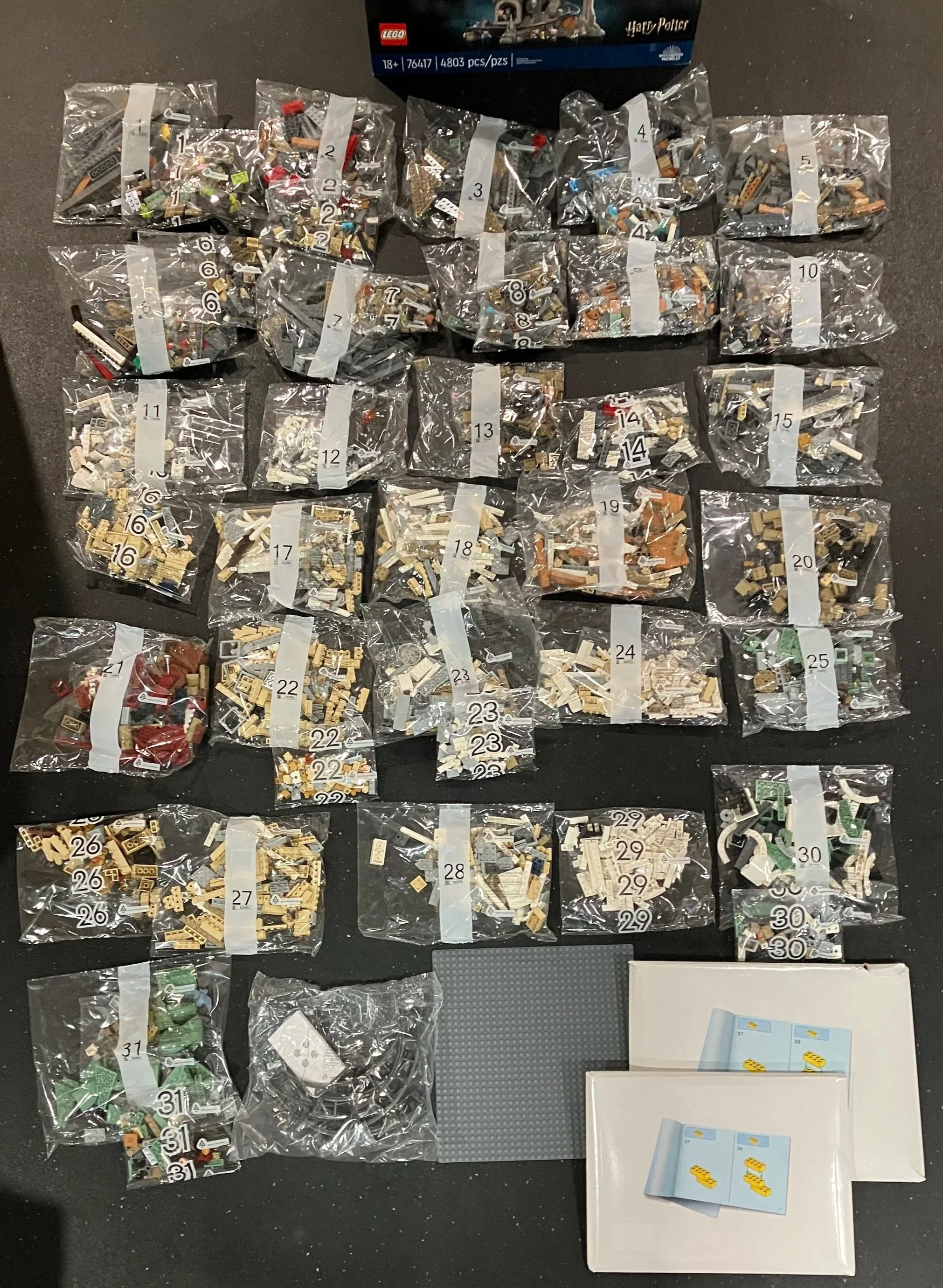 The set contains 31 numbered parts bags with one or two bags per number. There is one bag with the track, a box with the dragon wings, a dark gray base plate, and the instruction books in two paperboard envelopes.