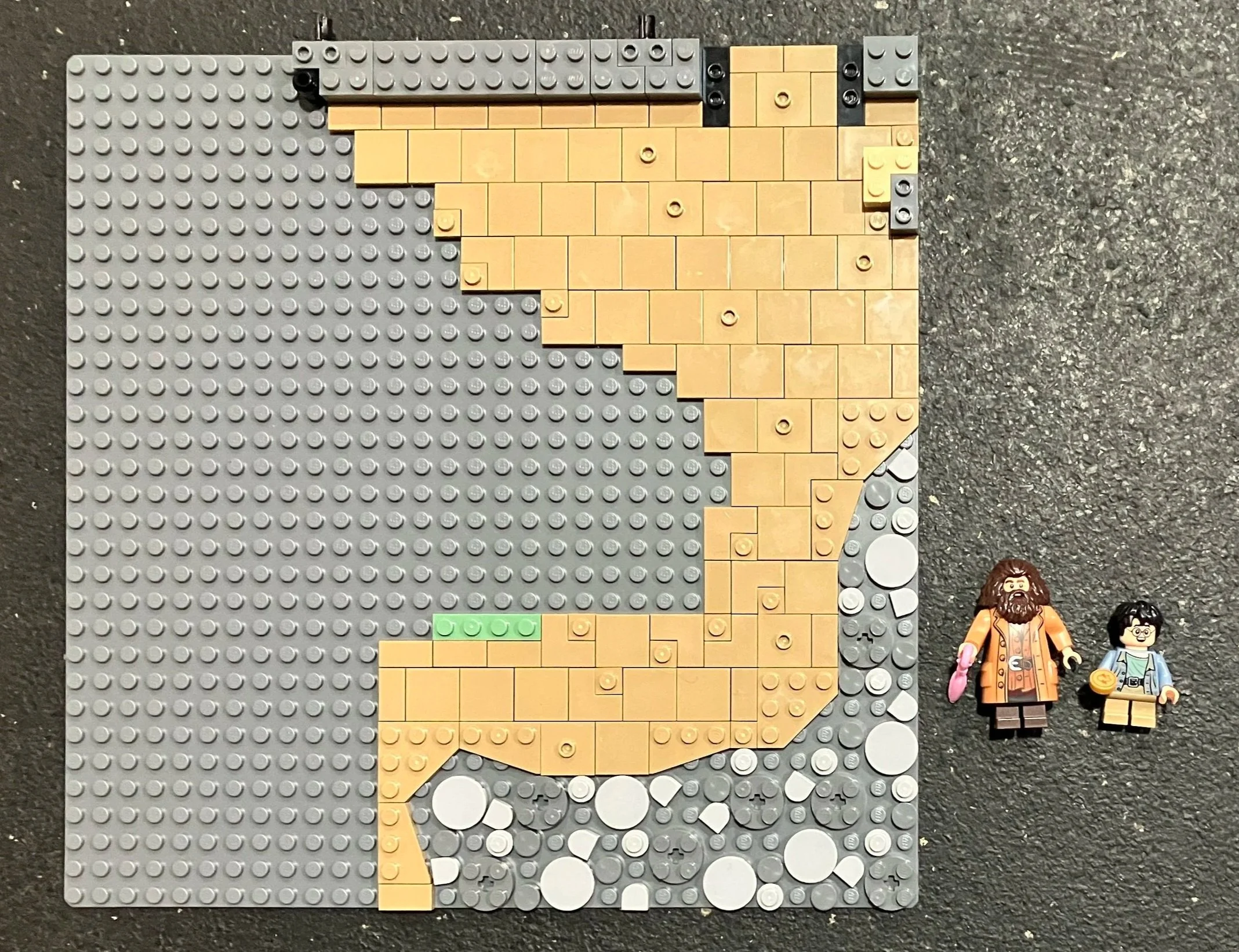 Build 13 starts the bank and adds the early Hagrid and Harry minifigures from the first movie. Bag 14 continues the build by adding in more of the flooring.