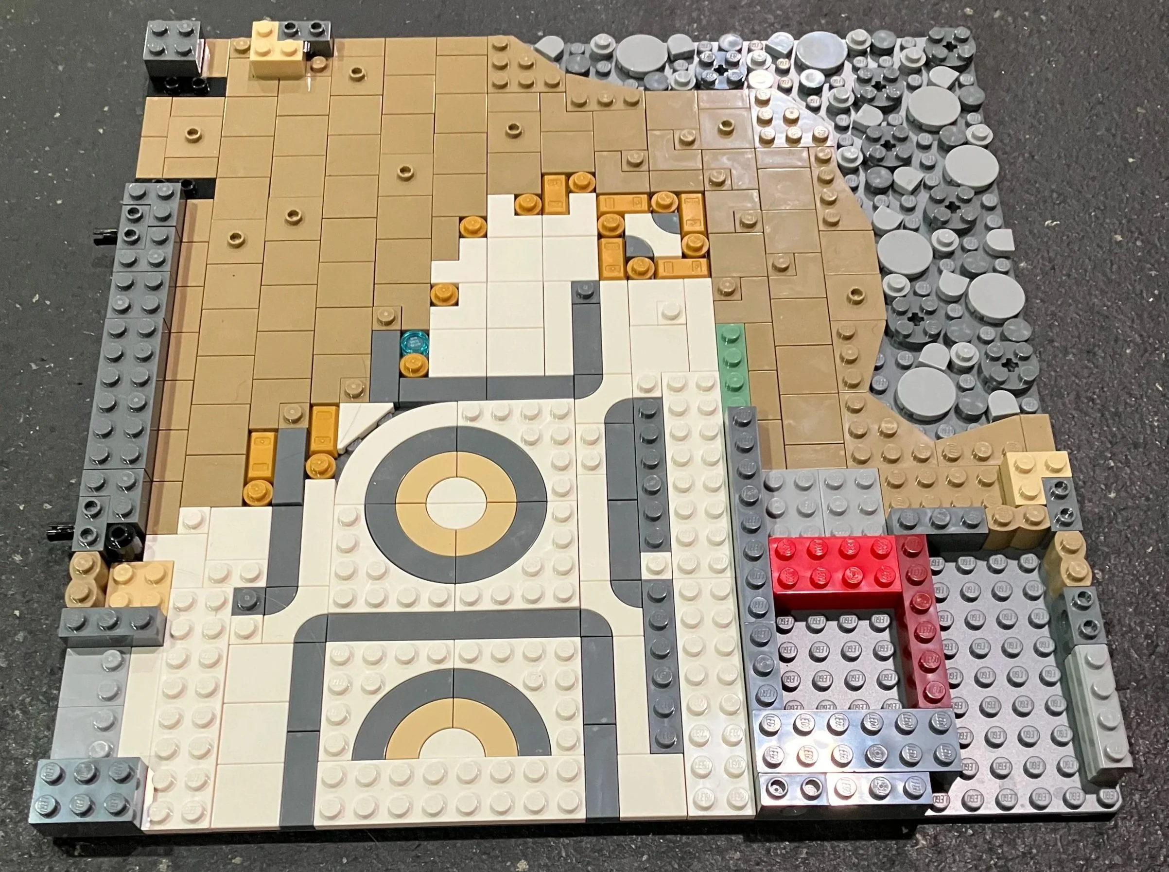 Bag 17 adds another wall and the front entrance. The front entrance has a different design where it looks like the front columns are angled to hold up the roof. They really aren’t structural pieces, but it’s a an interesting design to make it look that way. My kiddo put the sticker on so there is a gap if you center them. We didn’t discuss trying to line the stickers up closer so there wouldn’t be as much of a gap.