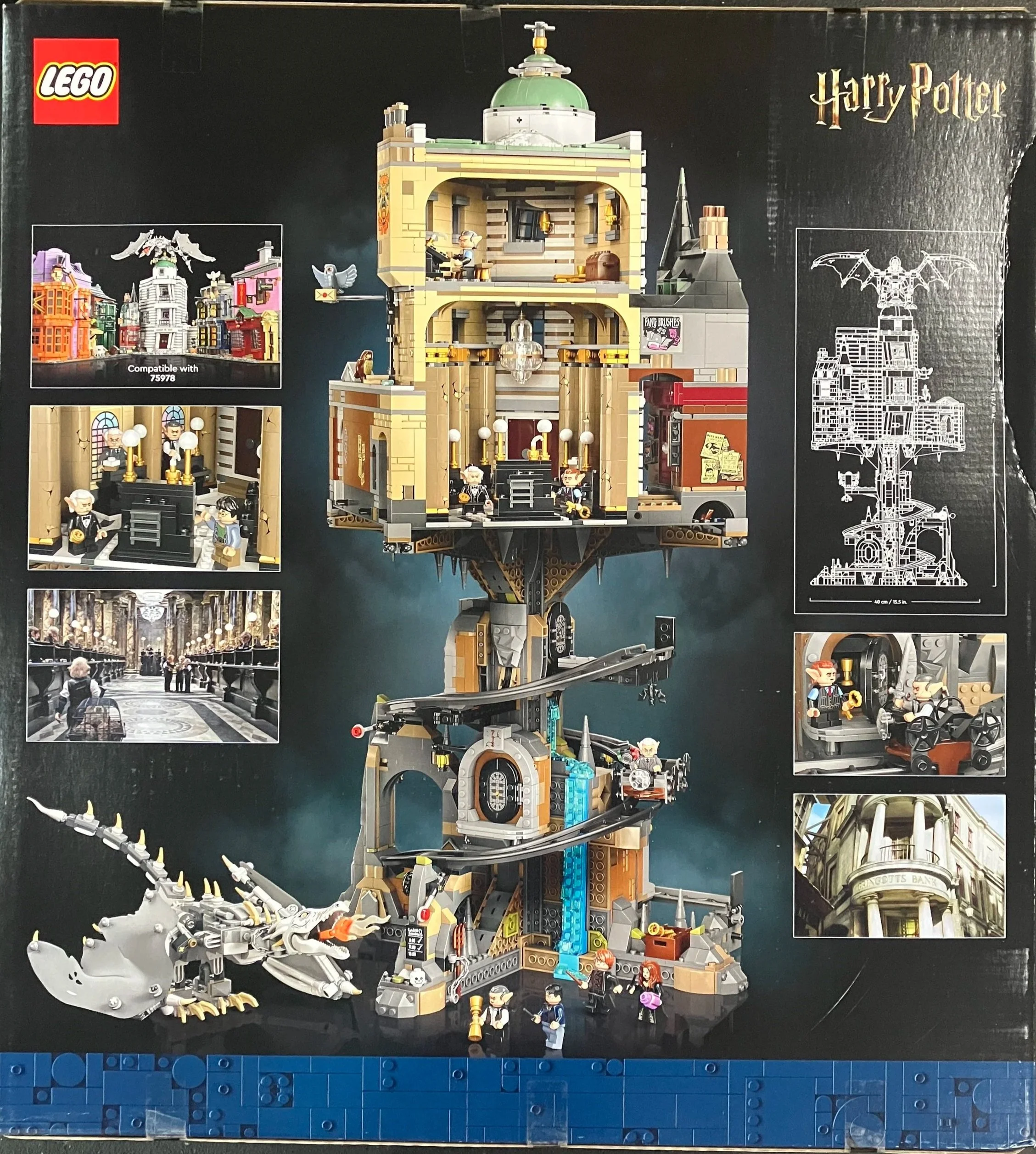 The front of the box shows the full set with a Gringotts logo and the 18+ branding on the bottom. The back shows some of the play features as well as set dimensions and how the set looks with the Diagon Alley set. The top of the box shows all of the minifigures.
