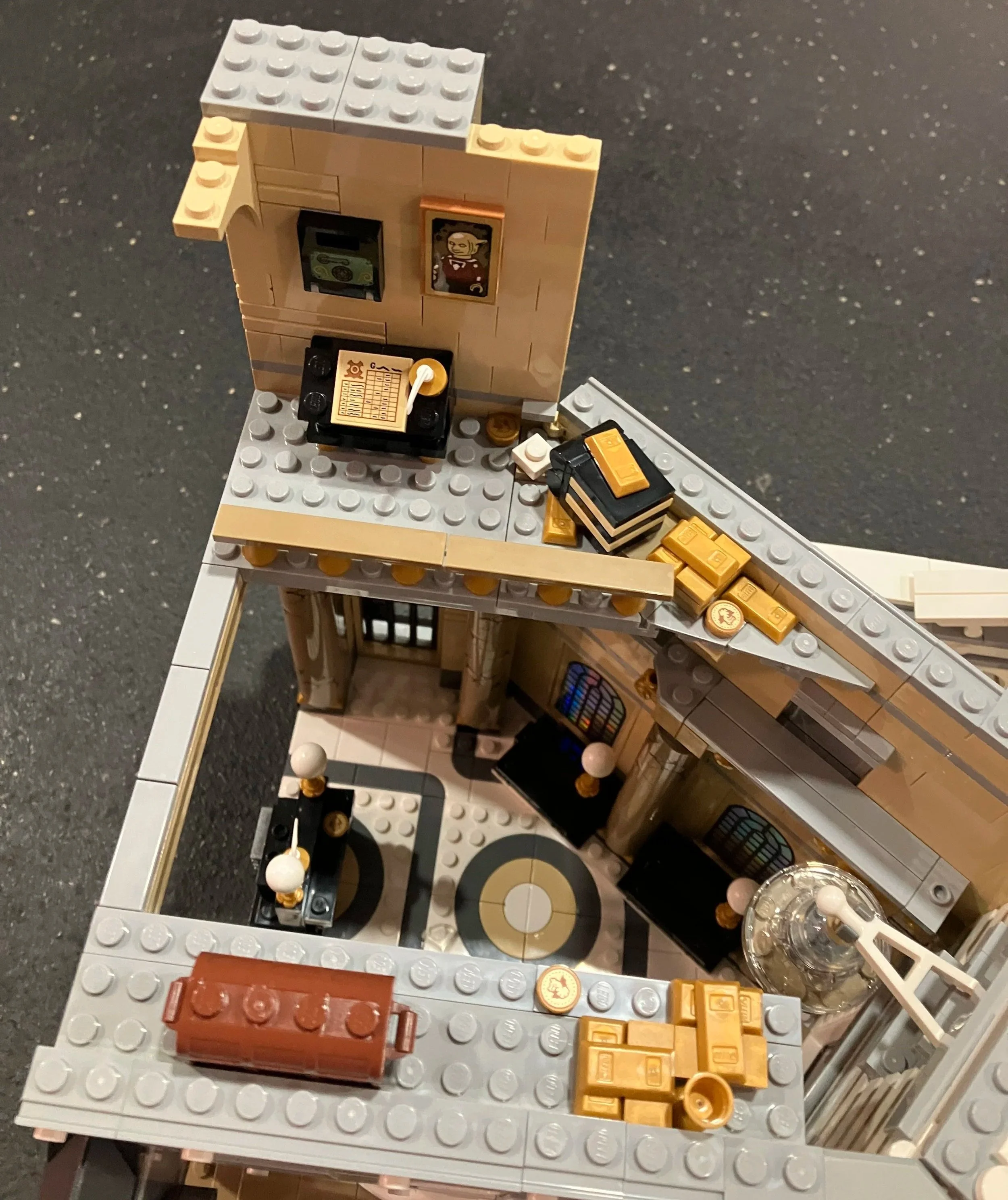 Here are some photos of the final set. It’s cool that it has the option to have the bank on top of the vaults area and then to remove the bank and have it separate. I enjoyed the build and there are some great pieces so a bonus there. In terms of price, it is just under $0.10 per piece so not too bad. There are a mix of small and large pieces so I think it’s reasonably priced. I’d recommend it… if it was still around. As mentioned, it apparently retired in the US, but will be available in other countries a bit longer.
