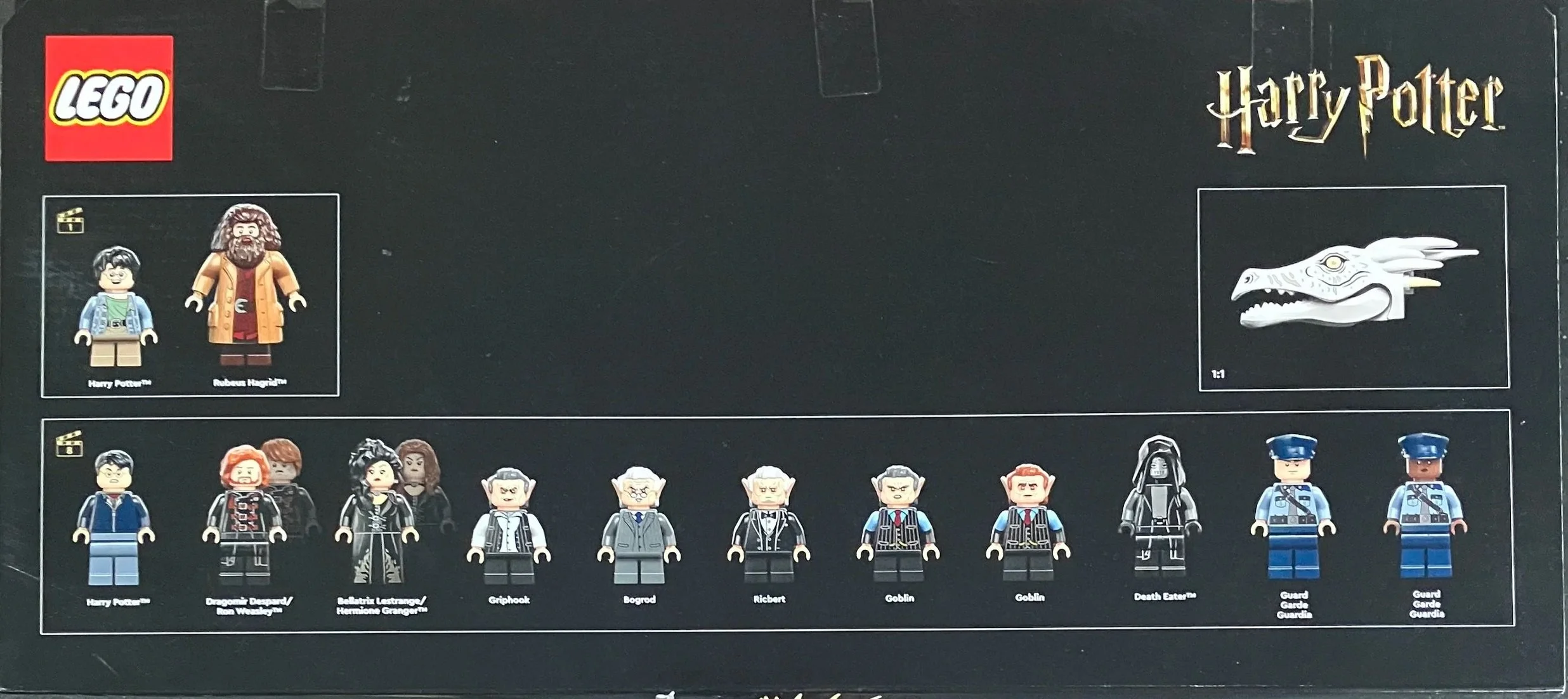 The set contains 13 minifigures. From the top, left to right, two guards, a goblin, Hermione, Ron and Harry (from the last movies), and then the bottom row, a death eater, four goblins (to include Grip Hook), and then Harry and Hagrid from the first movie.