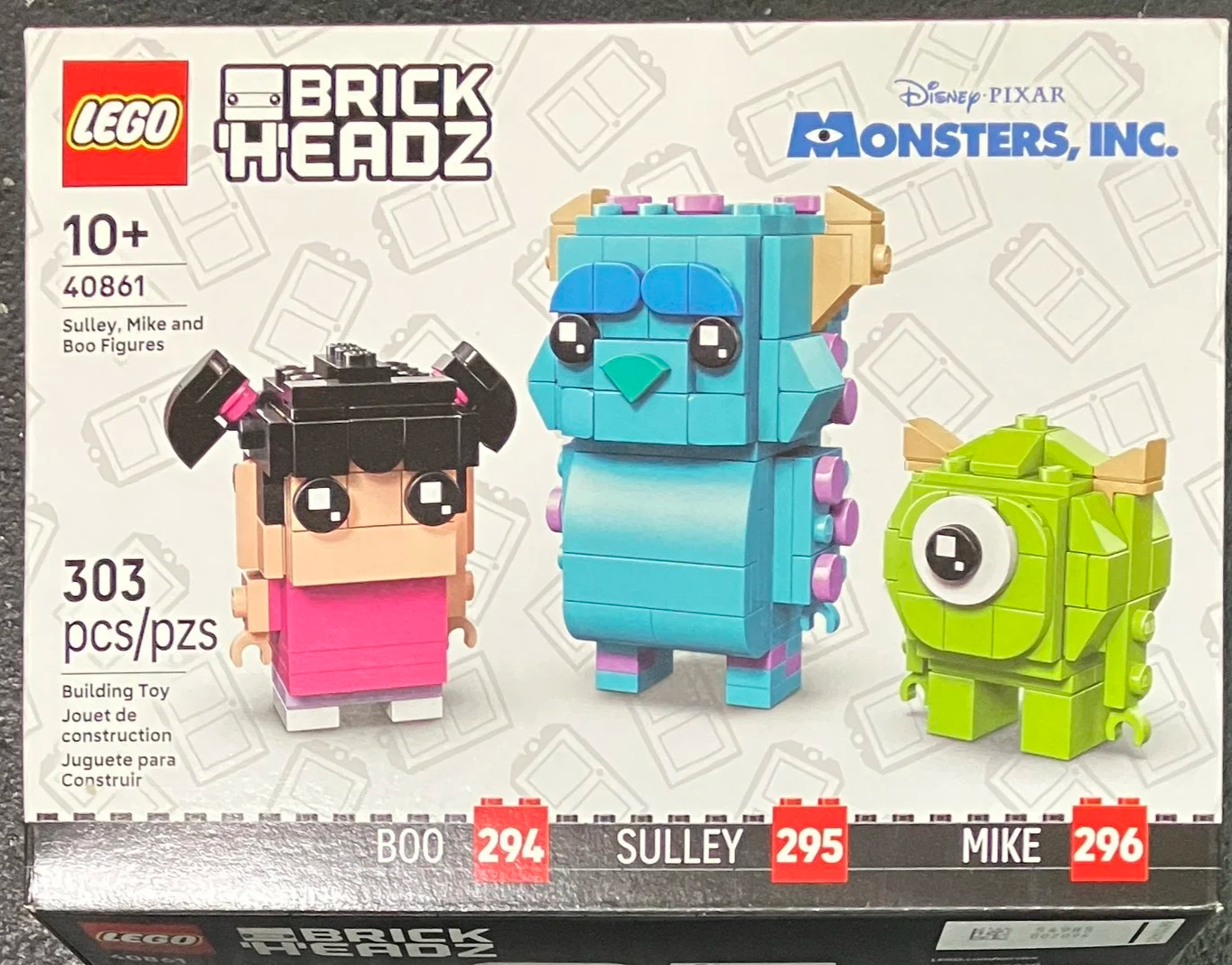 Mike Wazowski!!!! Sulley and Boo too! Another Disney Brickheadz set. This one is #40861-1: Sully, Mike and Boo. It was released on 2 March 2026 and retails for $24.99. It contains 303 pieces which works out to $0.082 per piece. We’re at Brickheadz numbers 294, 295, and 296. Can you believe we’ve had that many already?