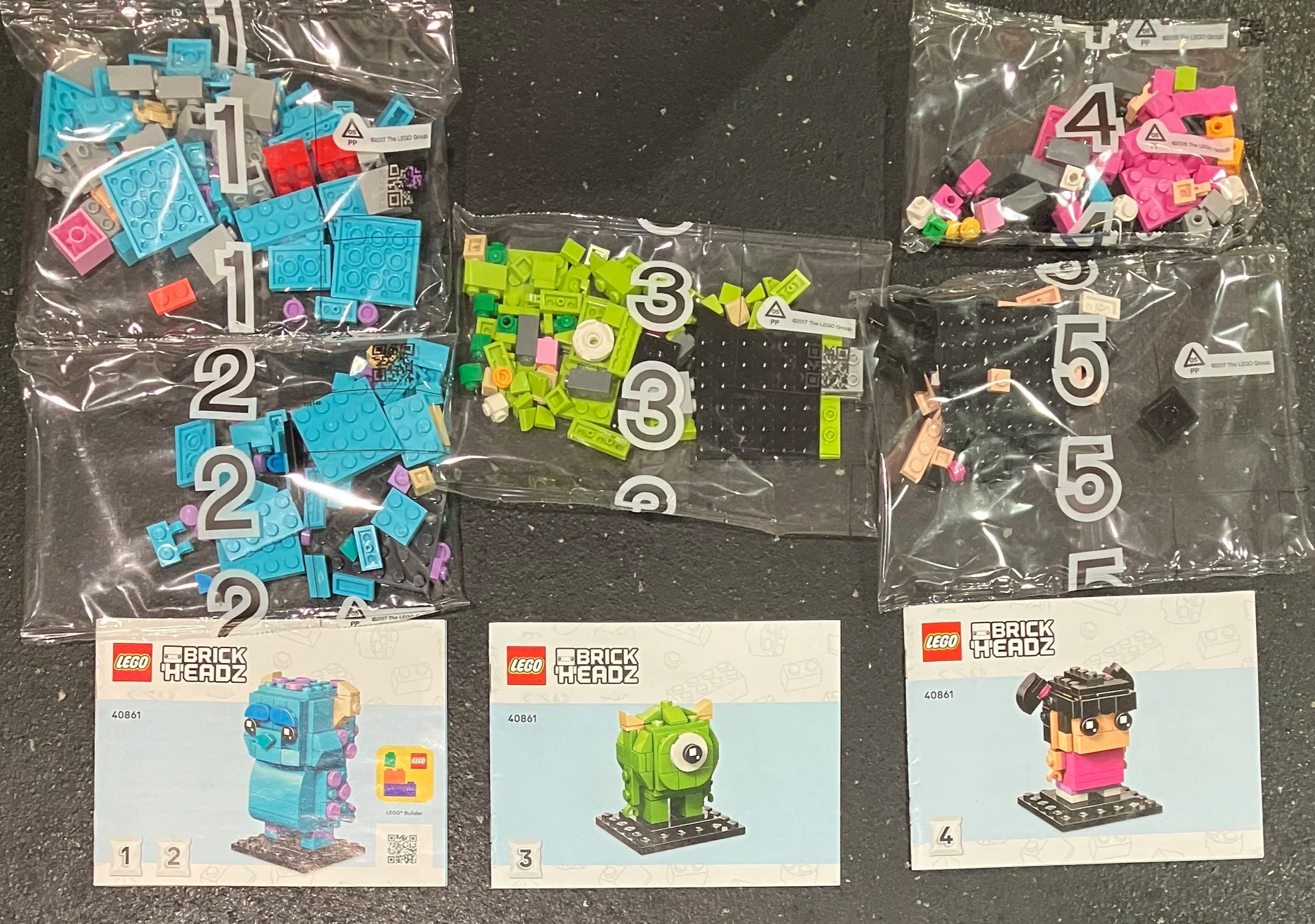 The set contains five parts bags and three instruction booklets. Bags one and two are for Sulley, bag three is for Mike, and bags four and five build Boo. Of note, the instruction booklet for Boo only lists bag four on the front, but inside includes the usage of bag five. Whoops! A quality control miss there LEGO.
