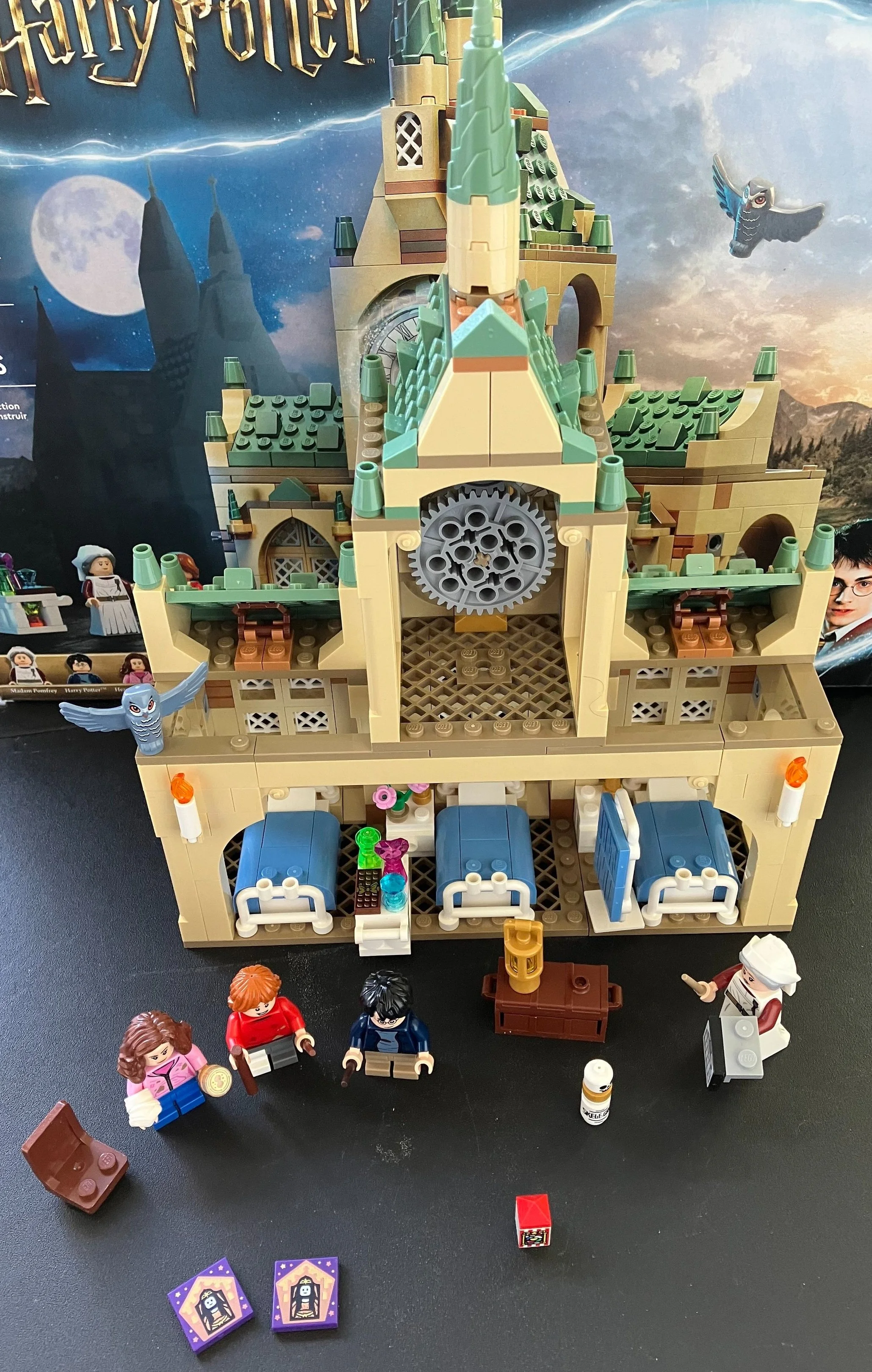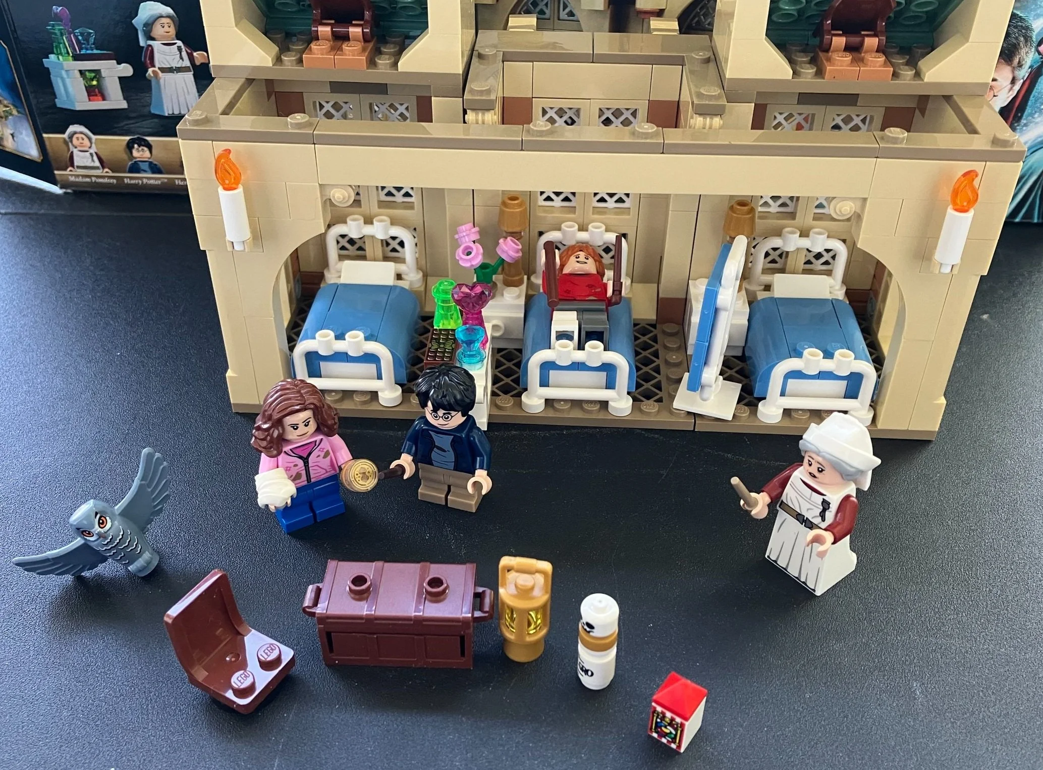 The third bag finishes out the details on the first floor with some candles, night stands with lamps by the beds, a cart near Ron’s bed with some of the well wishes he received, a divider for privacy, a chair, a trunk, a lamp, some medicine/potion, and a box of jelly beans (1x1 brick with printing). Harry and Hermione come in this bag. Hermione has her wand, a bandage around her arm, and her time turner (printed 1x1 round tile). There is also a grey owl in this bag.